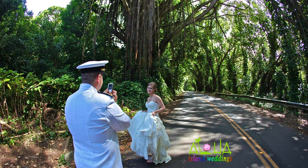the groom taking a photo pof the bride on the street oin the forest.jpg