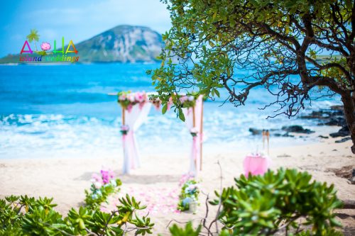 Pink wedding bamboo archway Hawaii beach wedding photos in Hawaii_-23