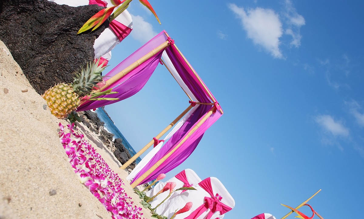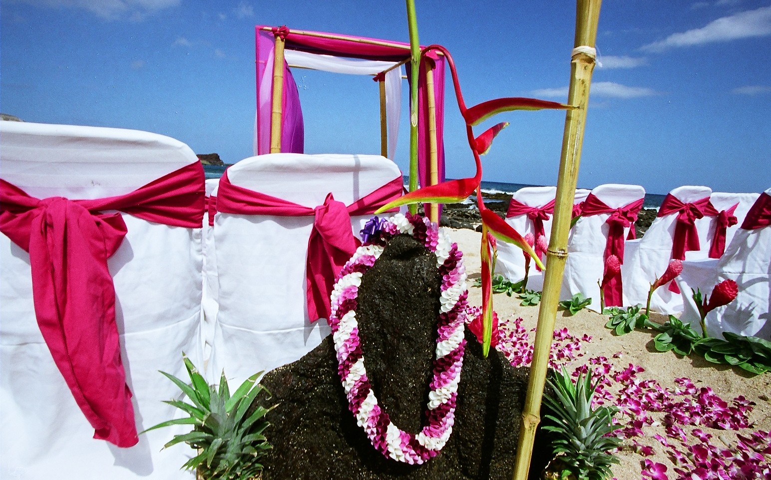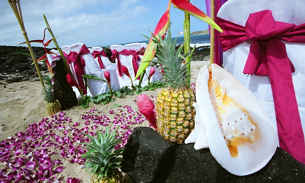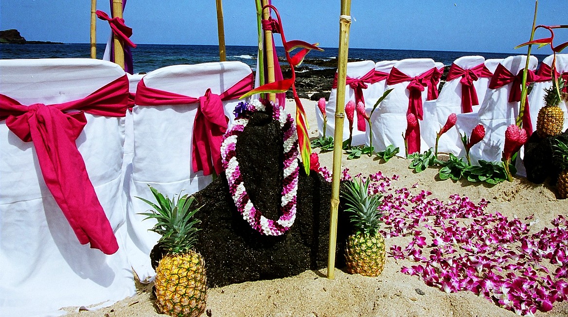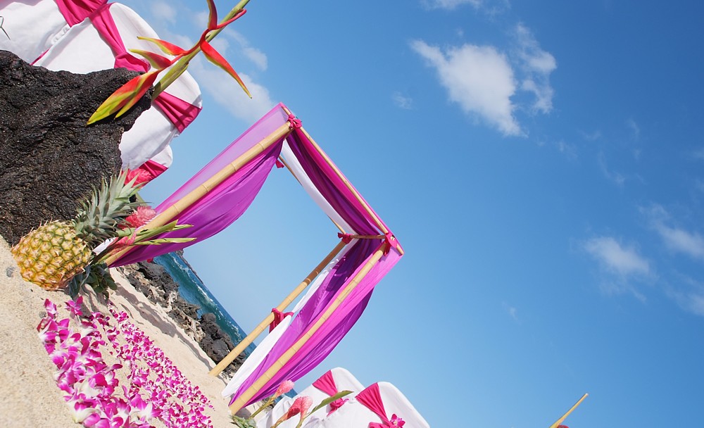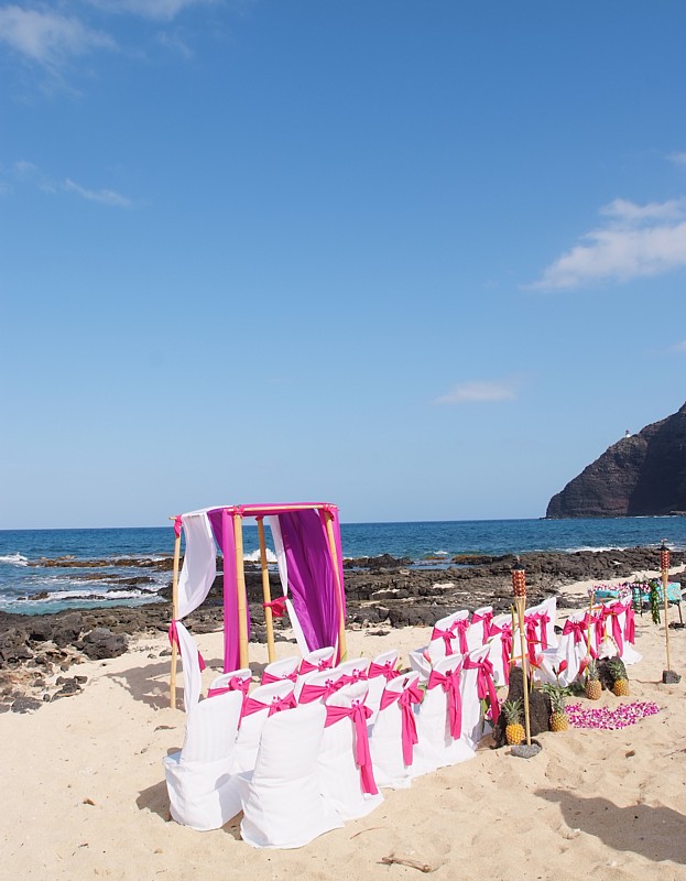 This photo shows a wedding setup on the beach of Oahu pineapples and dahlia orchid lei , lava rocks, fuscia chair sashes on white chairs covers, dendodrium orchids line the sand pathway to the bamboo alter.