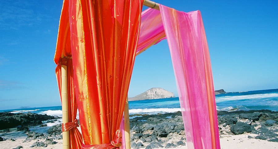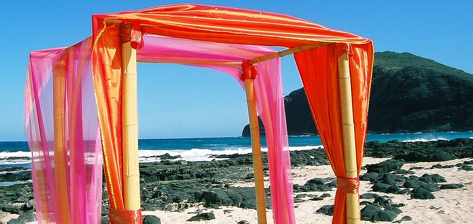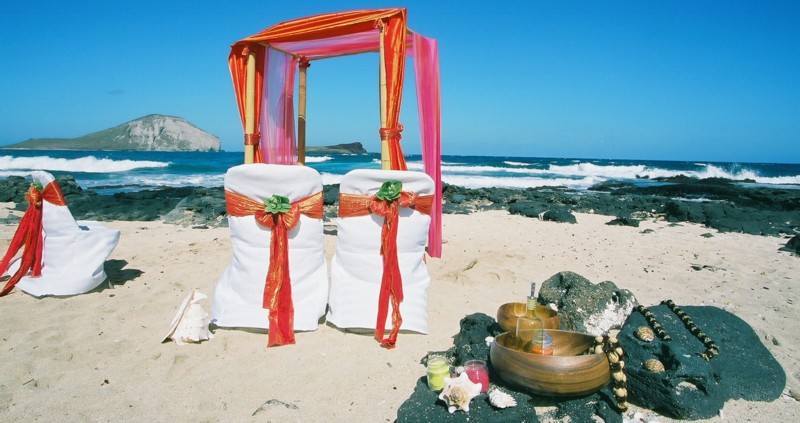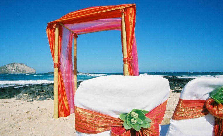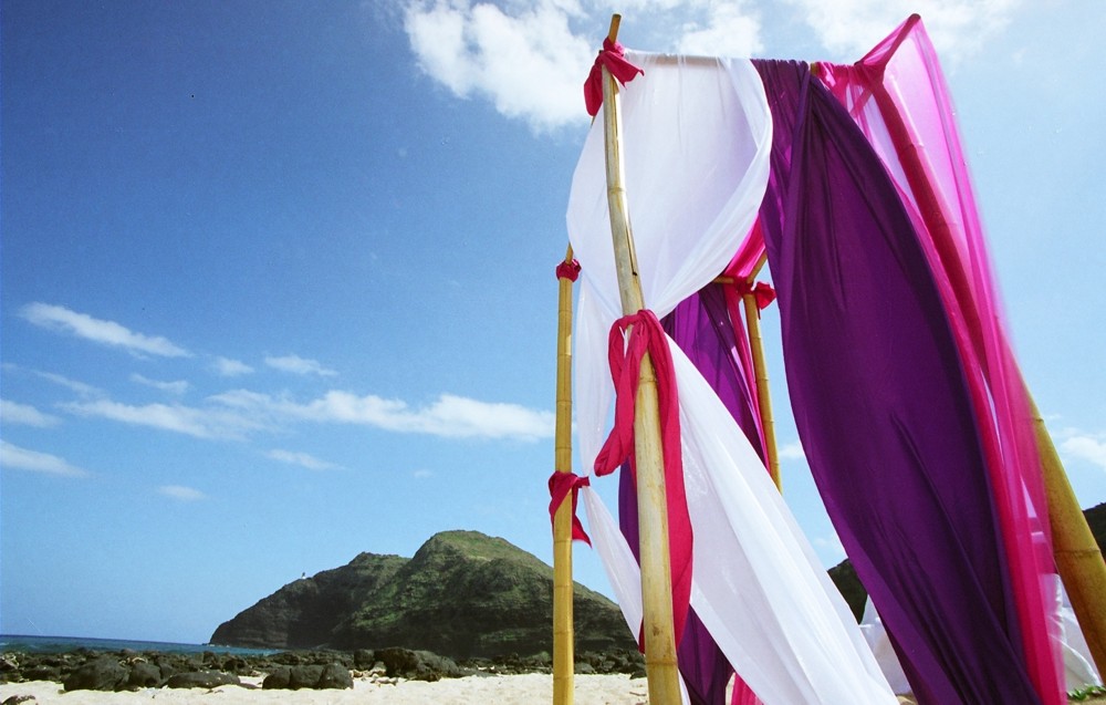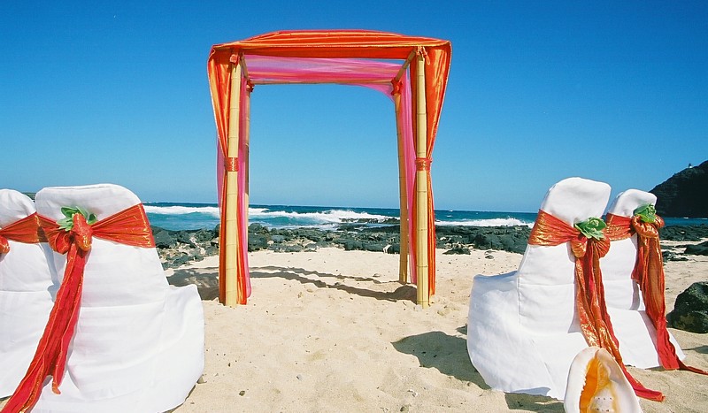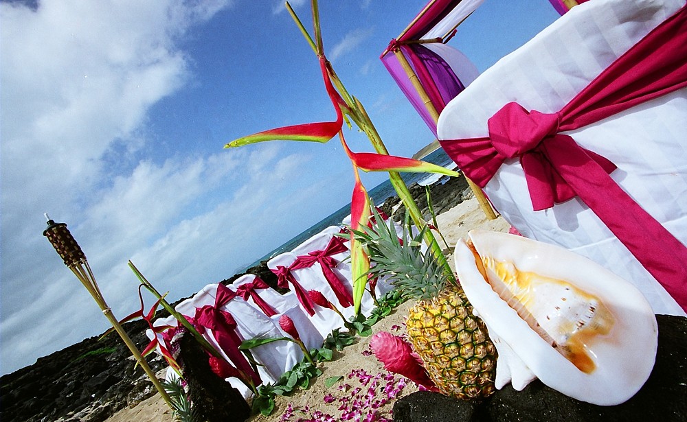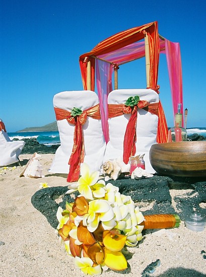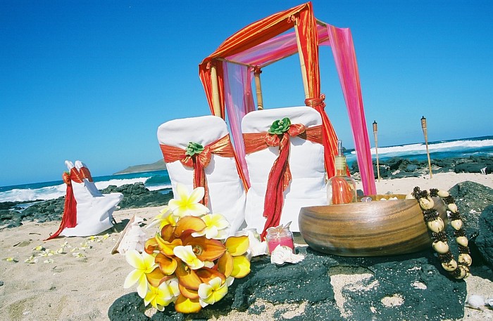 This photo shows a wedding setup on the beach of Oahu pineapples and dahlia orchid lei , lava rocks, fuscia chair sashes on white chairs covers, dendodrium orchids line the sand pathway to the bamboo alter.