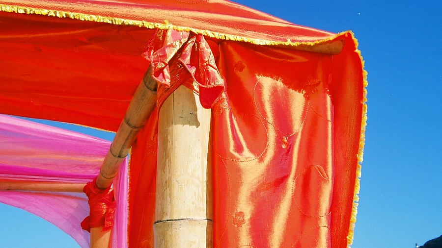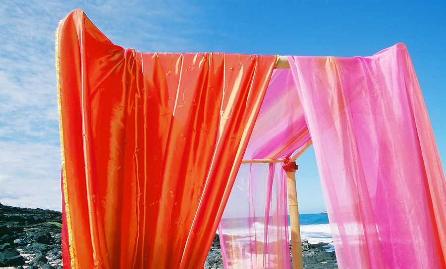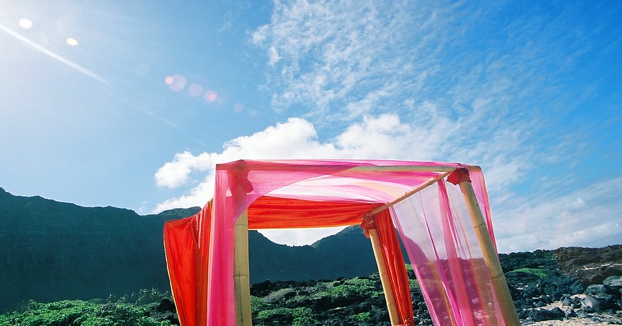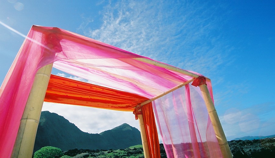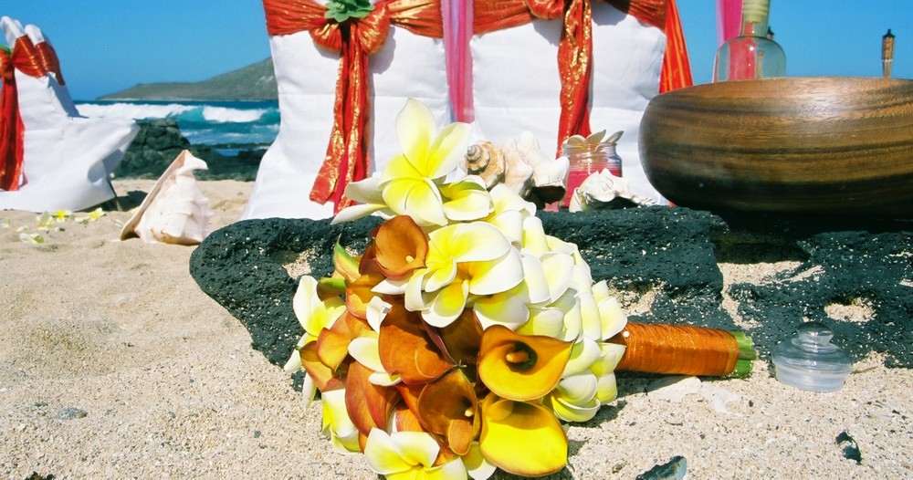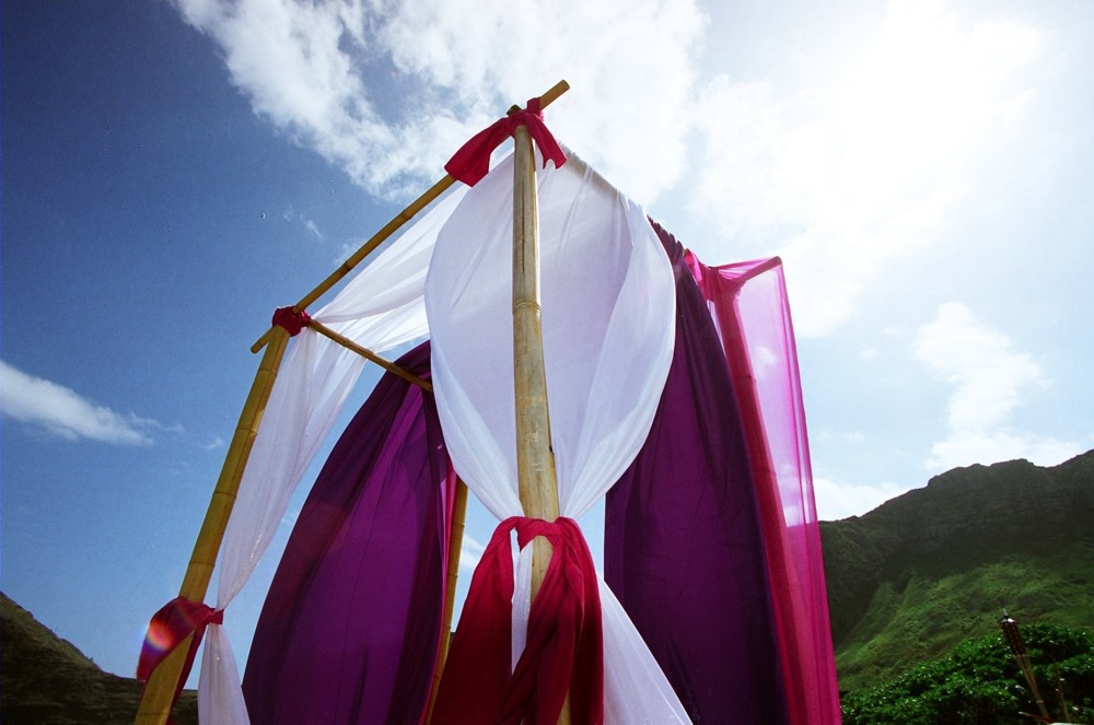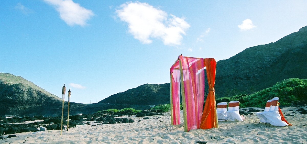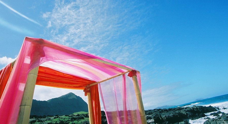 This photo shows a wedding setup on the beach of Oahu pineapples and dahlia orchid lei , lava rocks, fuscia chair sashes on white chairs covers, dendodrium orchids line the sand pathway to the bamboo alter.